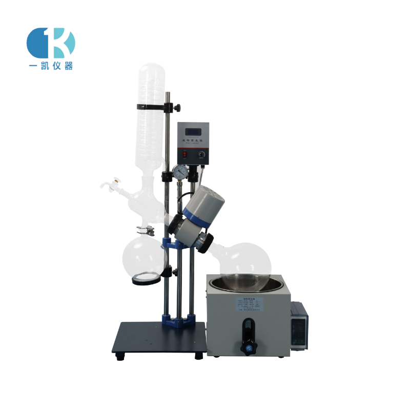 RE-501 旋轉蒸發器(5L),蒸發瓶恒速旋轉,水浴鍋恒溫加熱,在此條件下:物料在蒸發瓶內壁形成大麵積均勻薄膜快速蒸發,在真空條件下可以提高蒸發效率(需連接真空裝置),溶媒蒸汽經玻璃冷凝盤管時冷卻成液體(需連接冷卻裝置),回收於收集瓶。
